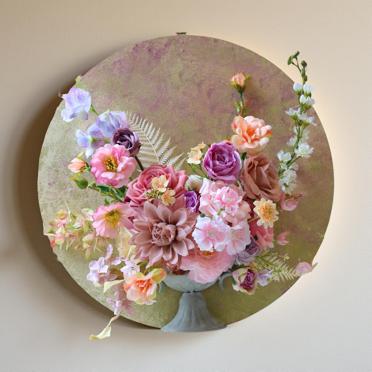 アンティーク調の円形キャンバスに、パープル・ピンク・ブルーの美しいグラデーションが広がり、まるで夢の中にいるかのような優雅な雰囲気を醸し出します。中央に配置されたローズと小花のブーケが、甘美で上品な彩りを空間に添えます。