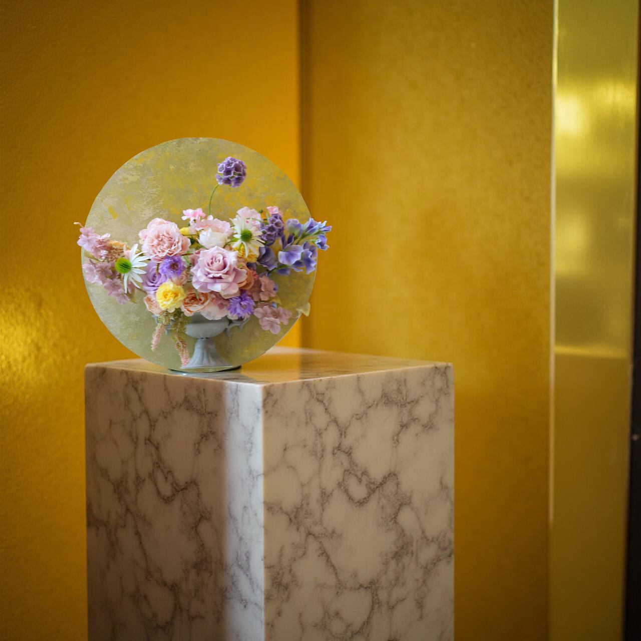 アンティーク調の円形キャンバスに、パープル・ピンク・ブルーの美しいグラデーションが広がり、まるで夢の中にいるかのような優雅な雰囲気を醸し出します。中央に配置されたローズと小花のブーケが、甘美で上品な彩りを空間に添えます。